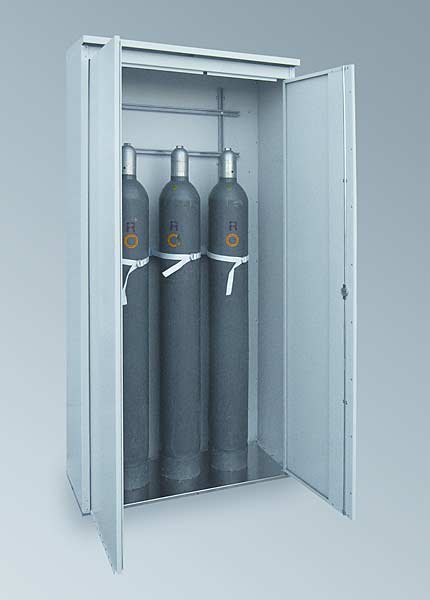 Druckgasflaschenschrank TRG Typ 1050 nach TRG-280 zur Lagerung von 3 Stck Druckgasflaschen in und außerhalb von Gebäuden, Breite 1050mm, Außenkorpus Lichtgrau RAL 7035, Türen wahlweise mit oder ohne PlexiglasausschnittLaborbedarf,Sicherheitsschränke,Gasflaschenschränke |