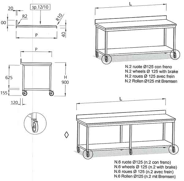 komplett geschweißte Struktur aus Rohr 40 x 40 mm und mit 4 Rollen Ø = 125 mm, davon 2 mit Bremsen/li>Ab Länge 2100 mm mit 6 RollenArbeitsplatte mit 1 gerundeten Seite aus Edelstahl Stärke 12/10 mit Aufkantung H = 100 mm auf der Rückseitemit verstärktem , zerlegbarem unteren BodenAb 2100 mm mit Zwischenstützen